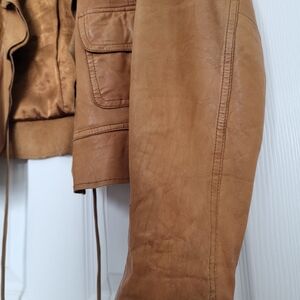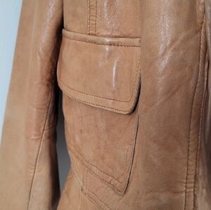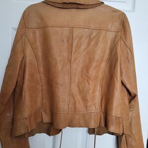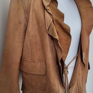 Beautiful cognac leather jacket by Old Navy, crafted in exceptionally soft lamb leather with a rich, broken-in feel that’s hard to find in newer pieces. This jacket features a feminine draped collar, adjustable tie waist, and a flattering, tailored silhouette that works effortlessly dressed up or casual.
