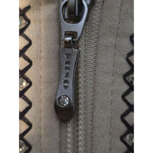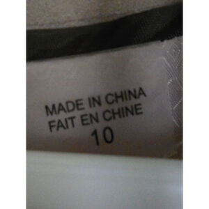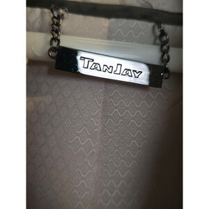 This is a pre-owned TanJay jacket, size 10. The outer shell is 100% polyester, exclusive of trimming, and the lining is 100% polyester. The jacket features a front zipper closure and decorative embellishments around the collar and front. The jacket is light beige. There are no visible imperfections. The jacket is machine washable in cold water with like colors.