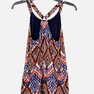 Pretty geometric/tribal print with a stylish racerback design. Fully lined for comfort and coverage. Great for casual wear, summer outings, or layering under a cardigan or denim jacket.