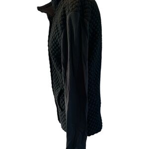 This is an incredibly versatile investment piece: Knit body texture, contrasting smooth arms, unique left-aligned covered zipper (not typical centered), pop collar, all stretch (but all lined) and functional pockets. A light/medium jacket (body still feels heavy) for outdoor warmth or indoor polish.
