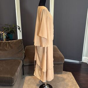 Women’s Tea Length Chiffon Dress with a Matching Chiffon Jacket and Corset Back. The dress has pretty layers on the front of the chiffon skirt, and detail around the waist.