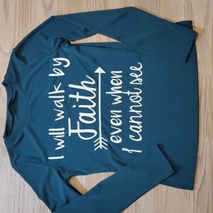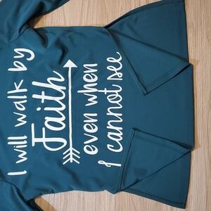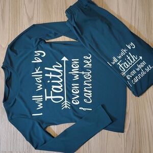 Spiritual Print says I will walk by Faith even when I can't see (print is located on the front right pant leg and front of shirt, rears do not have print)
