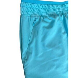 Women's Tek Gear Mid Rise Shorts XX Large, Party Blue, Teal (the color is closer to teal than what the pictures show). These active wear work out shorts have an elastic waistband and 2 side zipper pockets. They are moisture wicking and breathable, making them perfect for any type of exercise. Polyester and spandex.