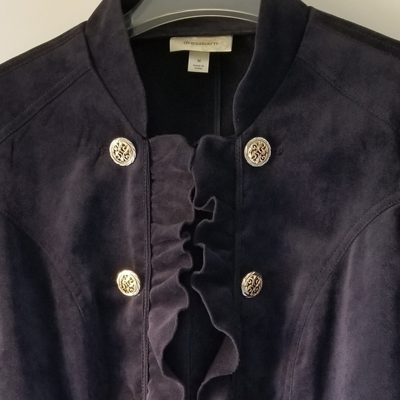Feel decadent in this deep navy jacket with ruffles and decorative golden buttons. But don't worry about ever losing a button, the jacket closes with a hidden line of hook-and-eyes. :)