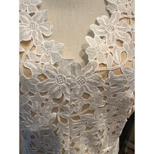 Peach colored slip dress with a cream colored appliqué over the dress. Full zipper knee length
