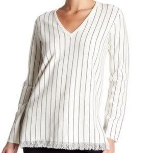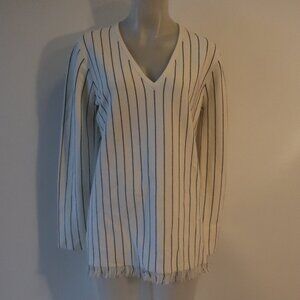 Womens Theory Hayden White Black Striped V-Neck Fringed Knit Pullover Sweater M*