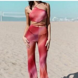 ✨ Womens Tie-Dye Mesh Halter Neck Lace Down Back Wrap Top & Flare Pant Set