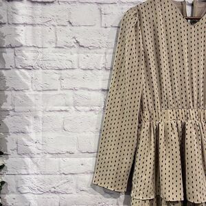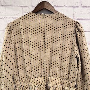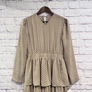 No size tags or material information. New dress a store owner had a sample of the dress it fits like a size medium. In the last picture there is a pen stain not very noticeable.