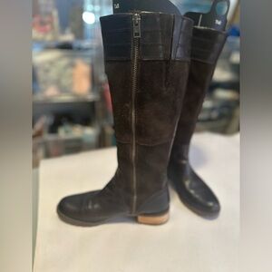 • Tall boot in smooth leather and suede featuring wide cuff with tonal topstitched stripes and stretch goring wedge