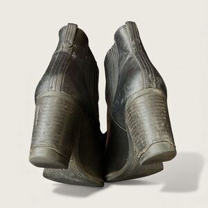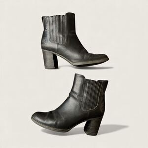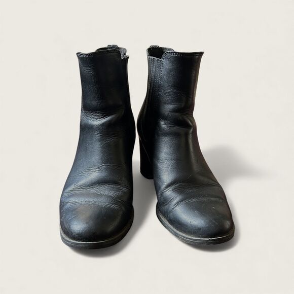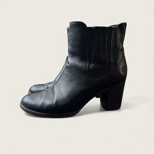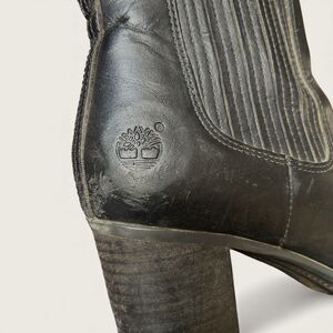 Womens Timberland Atlantic Heights Chelsea ankle boots in black leather. Features elastic double gore panels, rounded toe, and stacked block heel. Pull-on style with Timberland logo at heel. Pre-owned with visible wear including creasing and scuffing consistent with normal use (see photos). Soles and heels are solid. No structural issues noted.