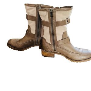 Zip sides, buckle accent, genuine leather and man made upper. Leather and man made lining, made made lug outsole. 1.5” heel. Marked sample inside. 9” tall.