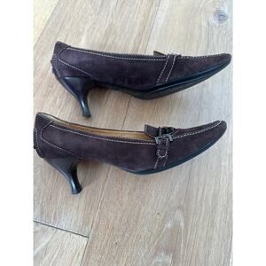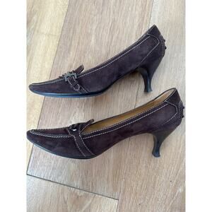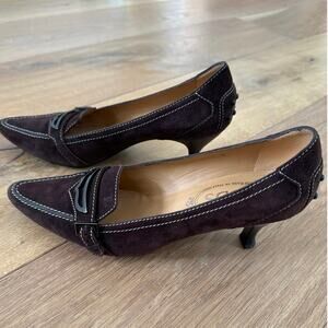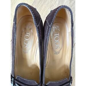 Gorgeous chocolate brown suede Tod’s driving loafer with contrast stitching and mini buckle. Silver hardware.