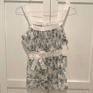 tags: twill twenty two toile floral print sleeveless top, feminine top, ribbon trim, embroidery, embroidered trim, bow adornment, feminine, romantic, date night top, daytime, nighttime, party sleeveless top, garden luncheon,broderie, floral top,toile fabric, petite