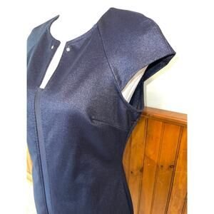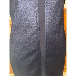 This dress is stunning! It is in excellent pre-loved condition! It feels and looks brand new! It is a metallic navy color and has a unique front design. The sleeves are a cap sleeve style. This dress has some stretch to it and is made to be fitted. The material is very durable! It is around knee length. This dress is perfect for the office or any evening event! Womens size 8.