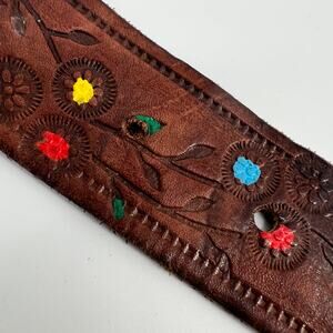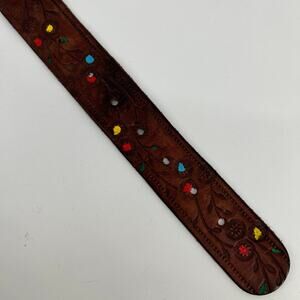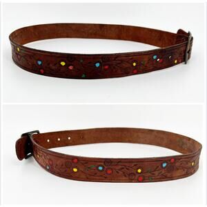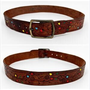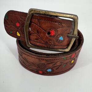 Womens Tooled Leather Belt M Brown Painted Floral Colorful Bohemian Western