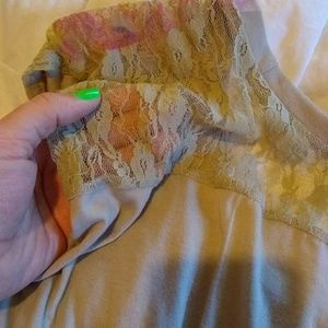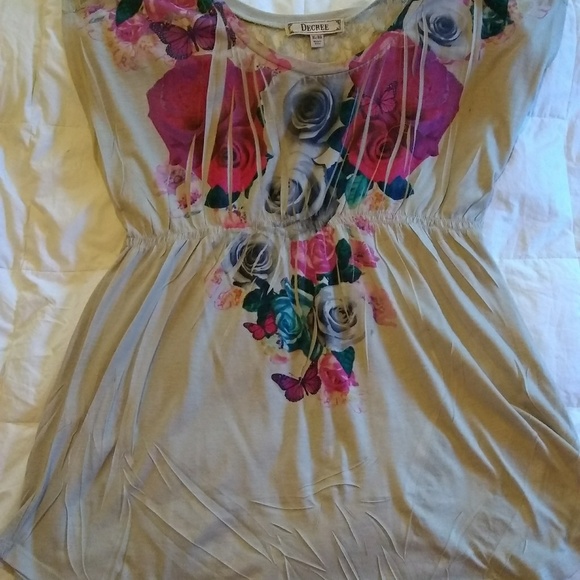 Being short sleeve top. Floral design on front. Back shoulder area and upper back is lace. I never wore it so no flaws. 100% polyester.