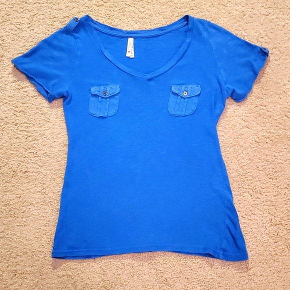 Women's v-neck blue shirt with 2 small pockets towards the top of the shirt. Runs a little small for a large. Non smoking environment.