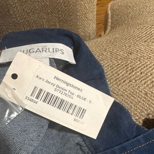 Denim blouse with a bow at the neck.