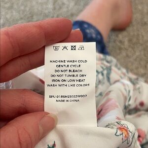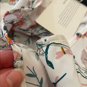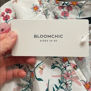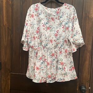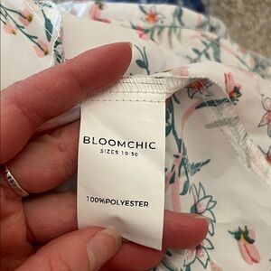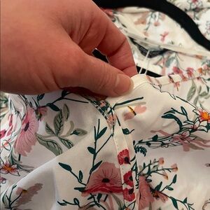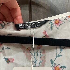 BloomChic blouse. White top with pink, green, and yellow floral detail. V-neck faux wrap top. There is a little snap/button at the top of the V (see pictures). The top also has flutter sleeves and a single elastic empire waistline. Super pretty!