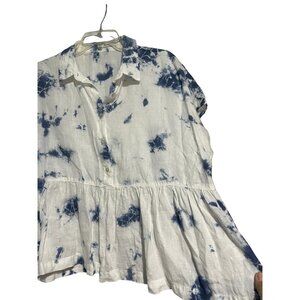 Women's Top Blouse 100% Linen Drop Waist Boho Blue White Size Large