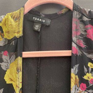 Beautiful floral Kimono full length in good used condition. This is sheer and lightweight. Look at pictures for details. Torrid brand women's 2X.