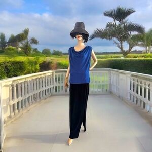 This #WomensTop is crafted from a soft, stretchy fabric blend that drapes beautifully. The deep cowl neckline adds a touch of sophistication, while the silver chain details bring a modern flair to this #BlueBlouse.