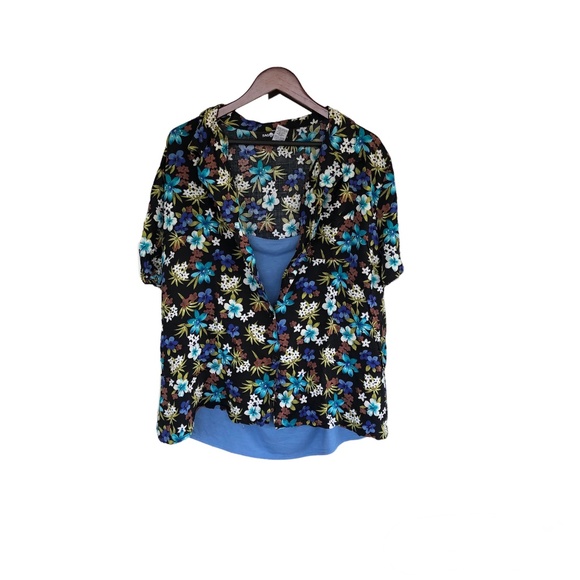 Womens Top Plus 3X Two Fer Floral Short Sleeve Dressy Blouse Blue Shell