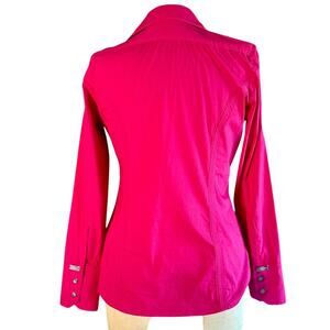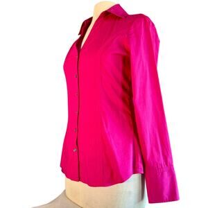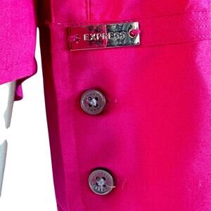 Elevate your wardrobe with our Express Collared Button-Up in hot pink, tailored to perfection in size small. Adorned with fun silver buttons featuring the Express brand embedded within, it adds a touch of whimsy to your ensemble. Complete with the iconic Express logo above the wrist buttons, it's a signature statement piece that exudes style and flair.