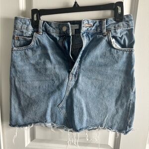 Trendy Topshop denim mini skirt in size 6. Classic light/medium wash with a raw frayed hem and five-pocket design. Perfect versatile piece that pairs easily with sneakers, sandals, or boots for a casual-chic look.