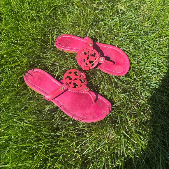 Add a bold pop of color to your look with these Tory Burch Miller sandals in stunning hot pink leather! They have the iconic laser-cut double-T medallion and polished gold rivet details. These sandals blend sophistication with fun summer energy! The cushioned leather footbed and slip-on thong design make them as comfortable as they are chic. They mix so well with solid neutral colors as well as prints! I have conditioned the leather so they are ready for use! Size 7.5