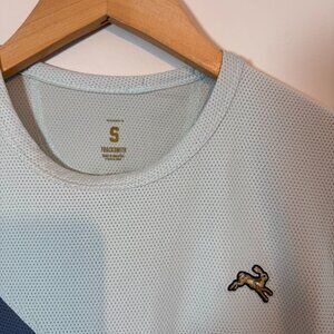 The Women's Tracksmith Van Cortlandt Tee in Sky Gray/Stone Grey, Size Small is a stylish and comfortable activewear top perfect for running and jogging. Made from a lightweight and breathable mesh fabric blend of polyester and spandex, this pullover crew neck shirt features a sleeveless design and striped pattern. It is designed to wick away moisture and provide an athletic fit, making it perfect for all seasons including winter, summer, fall, and spring. This Tracksmith tee combines style with functionality, ideal for women looking for a high-quality and versatile activewear piece.
