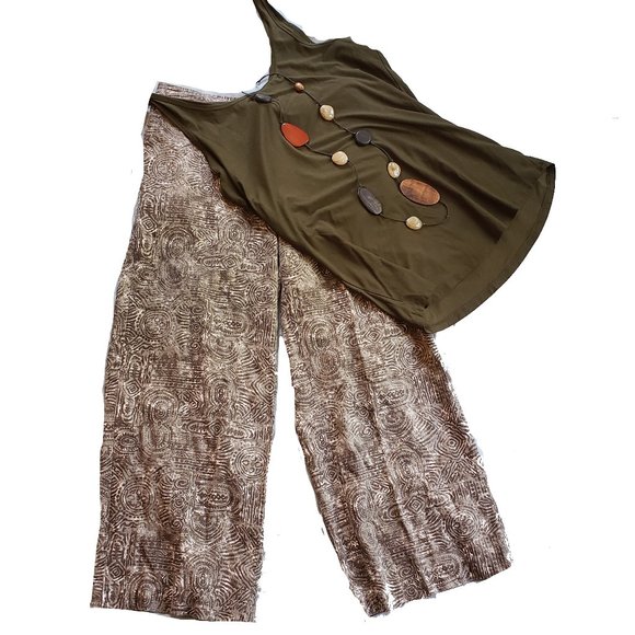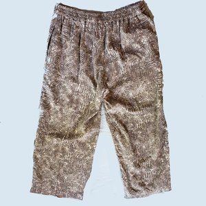 Comfortable pants with elastic in the waist and hidden side pockets. Print has colors of crème, and olive greenish and brownish tint. Casual and chic pants for almost any occasion. GUC no tears, stains or pulls.