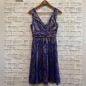 Women’s. Trina Turk. Purple silk dress with metallic (silver/gold) highlights. Deep v-neck. Sleeveless. Preowned excellent condition. No stains/tears. Size 4.