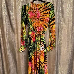 Good gently used condition, smoke and pet free home. No major flaws or signs of wear. This is sooo pretty! I wish I had this for a Hawaiian vacation. Semi sheer, you'll need to wear a mini dress or something under it if wearing out. Sleeves button at the ends, elastic inner waistband and this has a waist tie.