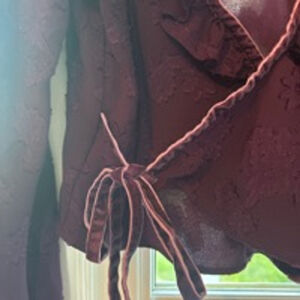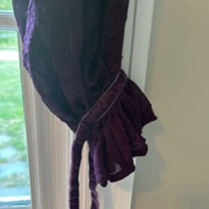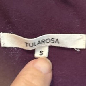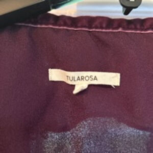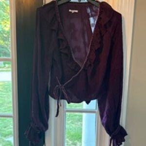 This is a Tularosa women's long-sleeve blouse in size S. It is a deep purple color with a floral pattern embossed on the fabric. The blouse has a wrap style with a tie at the waist and ruffles at the neckline and cuffs. The fabric is a lightweight, silky material. The blouse is in great condition with no visible tears or stains. The sleeves are long and have a slight bell shape at the cuff. The blouse is a versatile piece that can be dressed up or down.