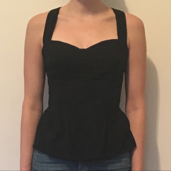 Women's "Tulle" black cotton peplum top with criss-cross straps in the back. Tonal eyelet pattern. "Smock-like" elastic back. Size MEDIUM, but can fit a small as well due to the elastic back. Minor wear under arms.