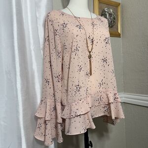 Women’s Top Ruffle Bell Flutter Sleeve Blouse Pink Button Key Hole Back Size L