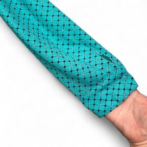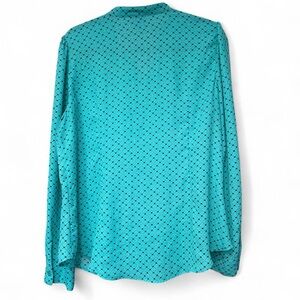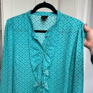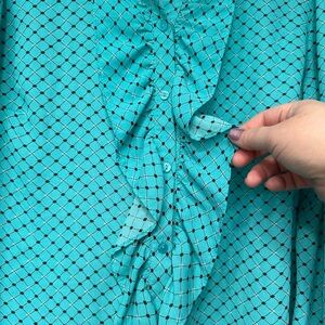 Elevate your style with this chic turquoise ruffle blouse • Perfect for any occasion, this top adds a pop of color to your wardrobe • Turquoise Polka Dot Button Up Blouse With Ruffle Collar Details • Pre-Loved in Excellent Condition • Worn a Few Times, No Noticeable Callouts • Fabric is Lightweight with Minimal Stretch • True to Size XL.