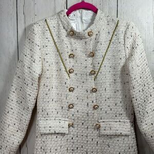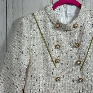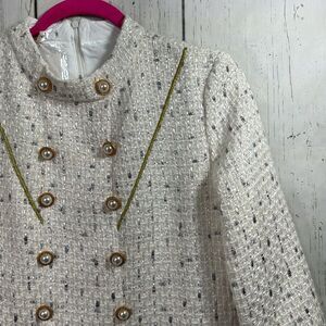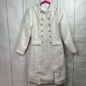Womens Tweed Long Sleeve Gold Pearl Button Detail Knee Length Cream Dress