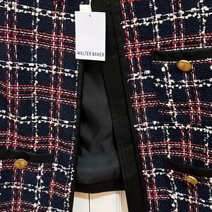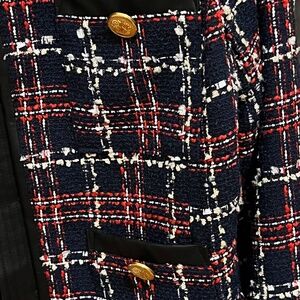 Medium Women’s blazer. Designer: Walter Baker. Color: Tweed, navy blue with red and white checkers. With 3 pockets and 3 gold buttons in the middle of the pockets. Material - 100% Polyester with Leather trimming. Lining - 100% Polyester.