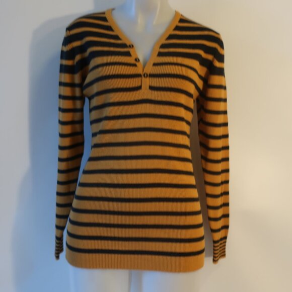 Womens Tween Mustard Yellow Black Brown Wool Blend V-Neck Striped Sweater M
