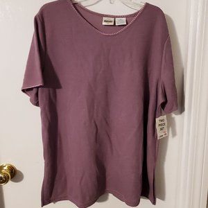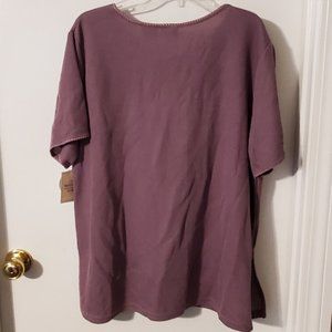 Tunic top is 100% pique' fabric in a plum color. There are side slits on each side. Measures 28" from back of neckline to hem.