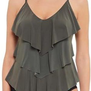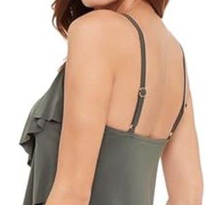 The V-neckline with underwire and removable soft cups accentuates your bust, highlighting your best features and downplaying the rest. The ruffle style top is very flattering and camouflages excess weight.