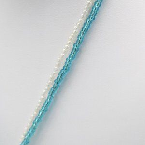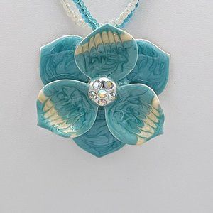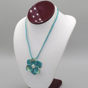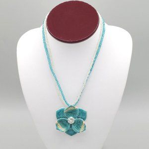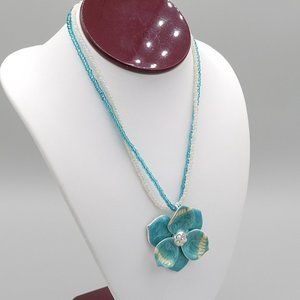Womens Two Strand Beaded Fashion Necklace Blue Flower Floral Pendant 15 in