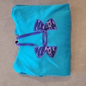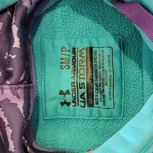 excellent condition- under Armour Storm hoodie. teal with purple camo logo on chest and lined hood. purple draw strings and large pocket for hands.