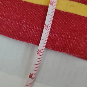 Women's UG Apparel long-sleeved tunic top, size L large, with a red and gold yellow washed out striped pattern, solid red sleeves, a v-neck, pockets, and an embroidered Iowa State logo on the left chest. Shirt is in excellent used condition. Measurements are approximately 4.5" to the v-neck, 27.75" in length and 21.5" from pit to pit. Also features 5" split seams at the sides.