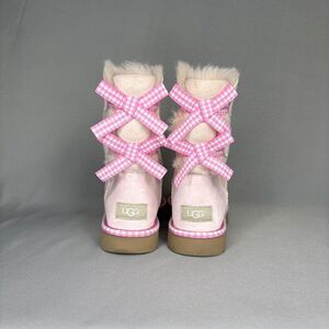 These women's take your breath away, very rare find in this color, Gingham UGG Australia Pink Seashell Bailey Bow boots come in a size 7. The boots feature lambskin or sheepskin suede outer and sheepskin shearling wool lining the inside with a wool insert, providing comfort, cushioning, and amazing warmth for your feet, while you look incredible simultaneously! They have been worn very little. There is no foot imprint, but some marks, so see photos closely.