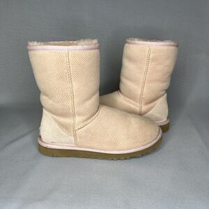 Women's light pink UGG Classic Short perforated boots in size 6. These UGG boots are perfect for any occasion, whether traveling, comfortable commuting, going to school, just running errands, festival party going, or a surfer chic trying to keep warm after a day in the water. They range from coquette, bohemian, boho, Lana del rey, to Malibu vibe. They are a fairly rare style and good pre-owned condition with normal wear and tear, in the form of some stains or marks, but boot is sturdy. Unique, cool style of Ugg boot.