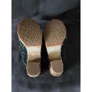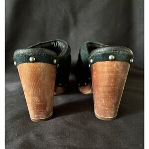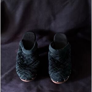 Super cute!! Women’s UGG Kaylee Black Suede Wooden Platform Clog Mules Stud Braid, size 6. They do show light wear but are in good, used condition