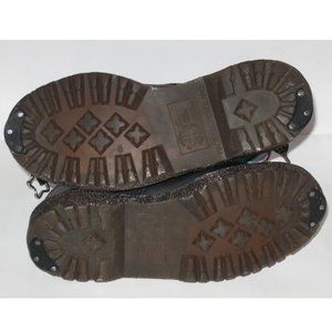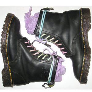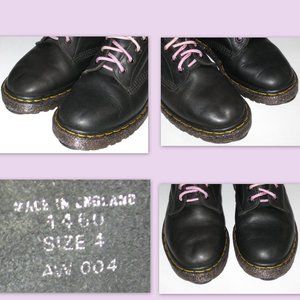 Customized and 1-of-a-kind. Unlike most 'shiny'/patent-leather DM's, these are made of soft, open-pored, extremely durable leather. This means that you're not likely to develop cracks at the toe-creases any time soon. They were made in England, so the UK size (4) is stamped on the footbed and tongues. The polyurethane trim/piping around the top of the cuff is cracking, as highlighted in picture #6. Thanks for looking, -Johnny